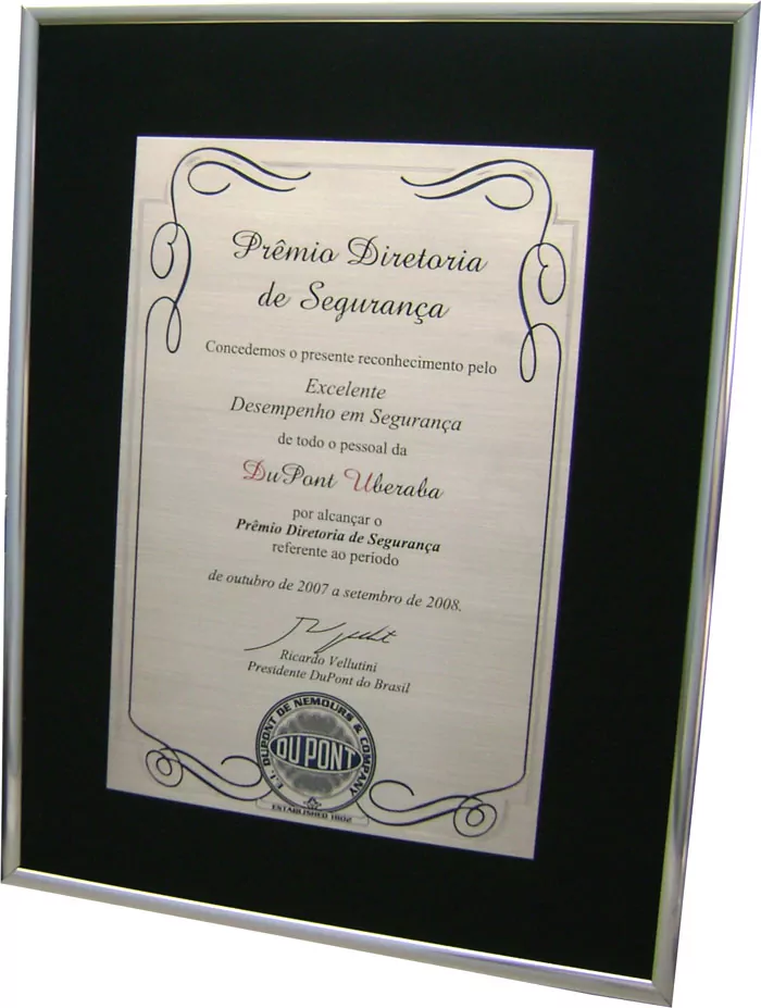 Réplica de certificado concedido pelo excelente desempenho em segurança alcançando o Prêmio Diretoria de Segurança.